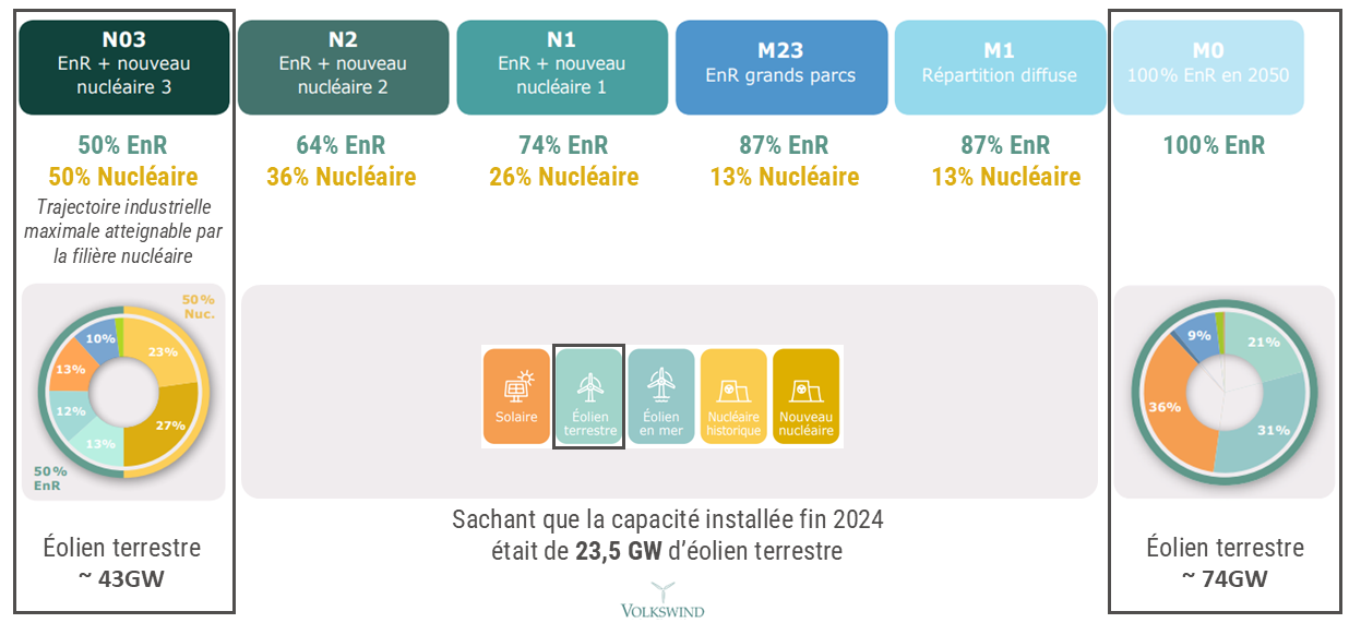 Ci-dessous un focus sur 2 scénarii : d'un coté un scénario 100% ENR qui est réalisable avec la potentialité du territoire français et d'un autre un scénario qui mise autant que possible sur le nucléaire mais qui doit toutefois comporter 50 % d'ENR.