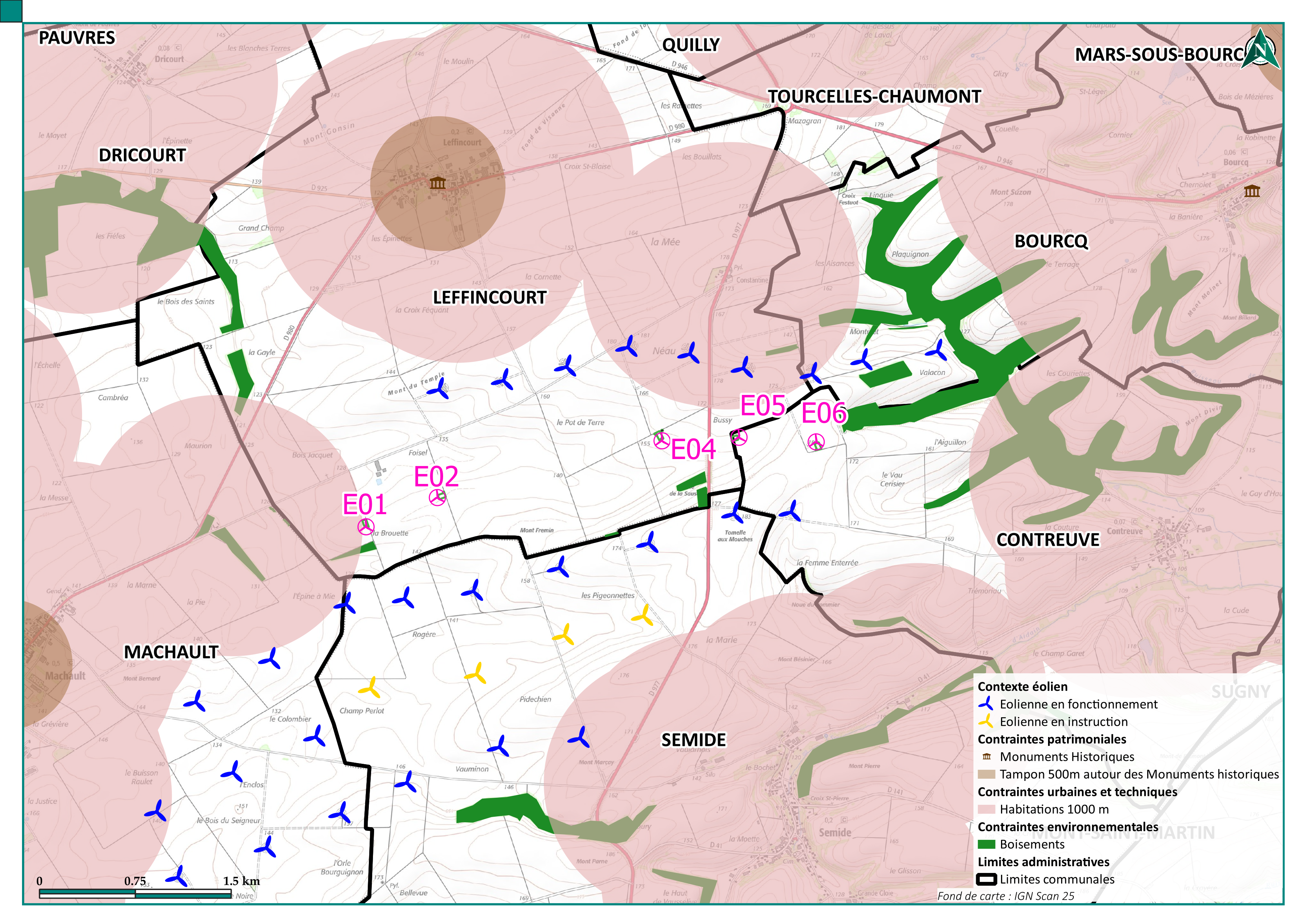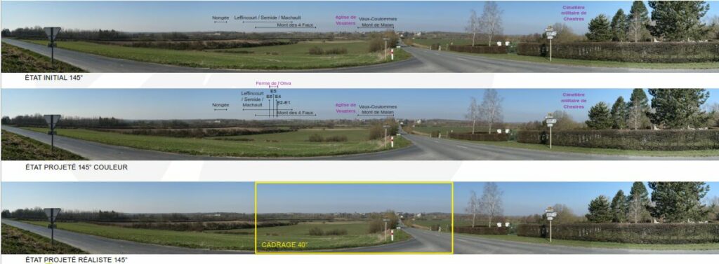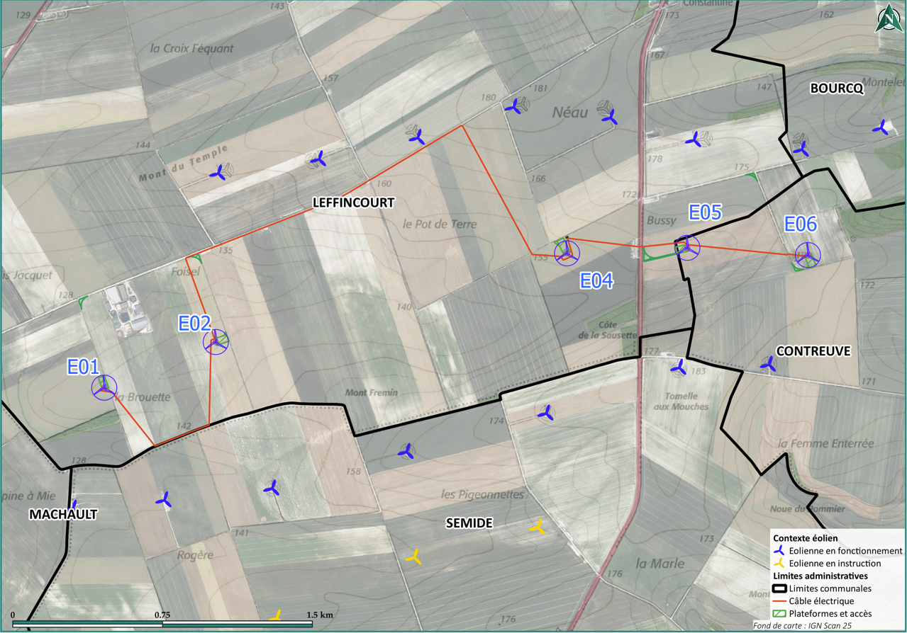 Le projet de la Ferme éolienne de l’Oliva s’implante sur les communes de Leffincourt et Contreuve, en continuité du parc existant de Leffincourt, entre deux lignes d’éoliennes à proximité des départementales 980 et 977.